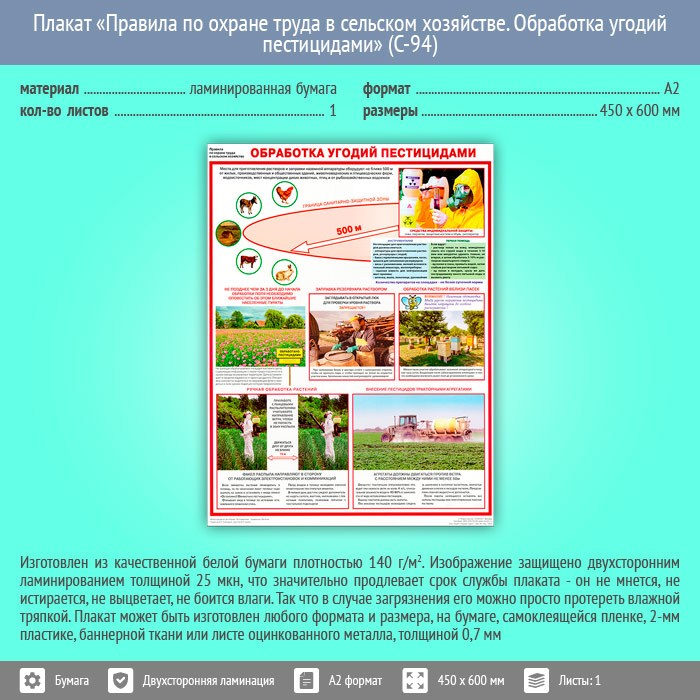 Плакат «Правила по охране труда в сельском хозяйстве. Обработка угодий пестицидами» (С-94, ламинированная бумага, А2, 1 лист) в Омске купить
