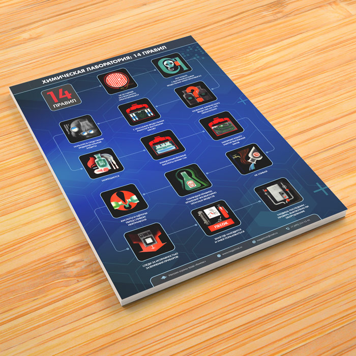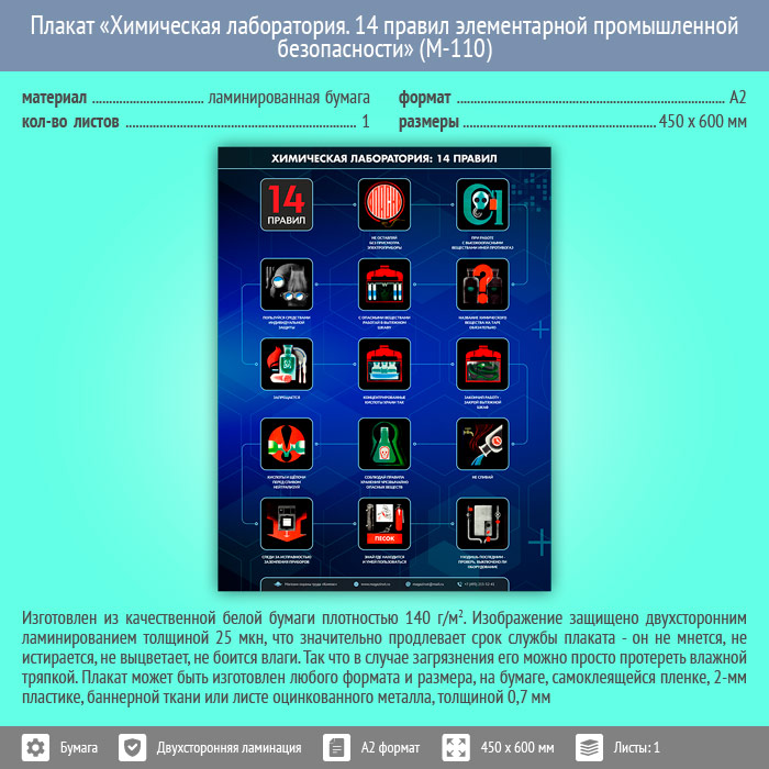 Плакат «Химическая лаборатория. 14 правил элементарной промышленной безопасности» (М-110, ламинированная бумага, А2, 1 лист) в Омске купить