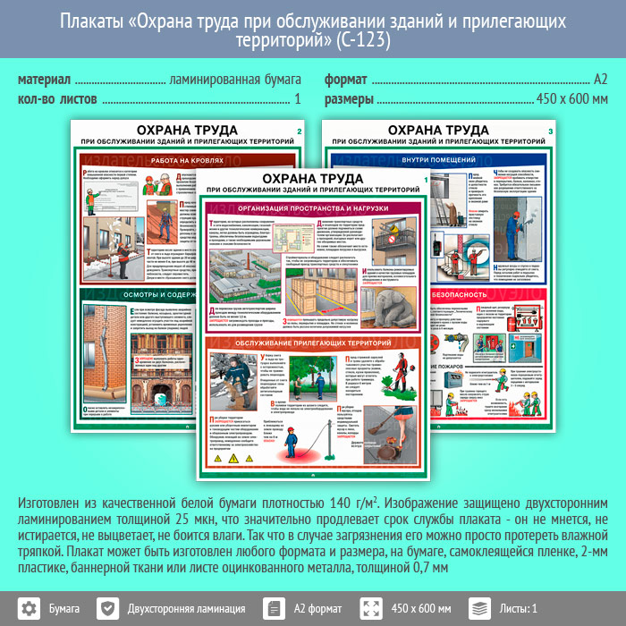 Плакаты «Охрана труда при обслуживании зданий и прилегающих территорий» (С-123, ламинированная бумага, А2, 3 листа) в Омске купить