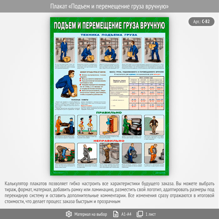 Плакат «Подъем и перемещение груза вручную» (С-82, 1 лист) в Омске купить