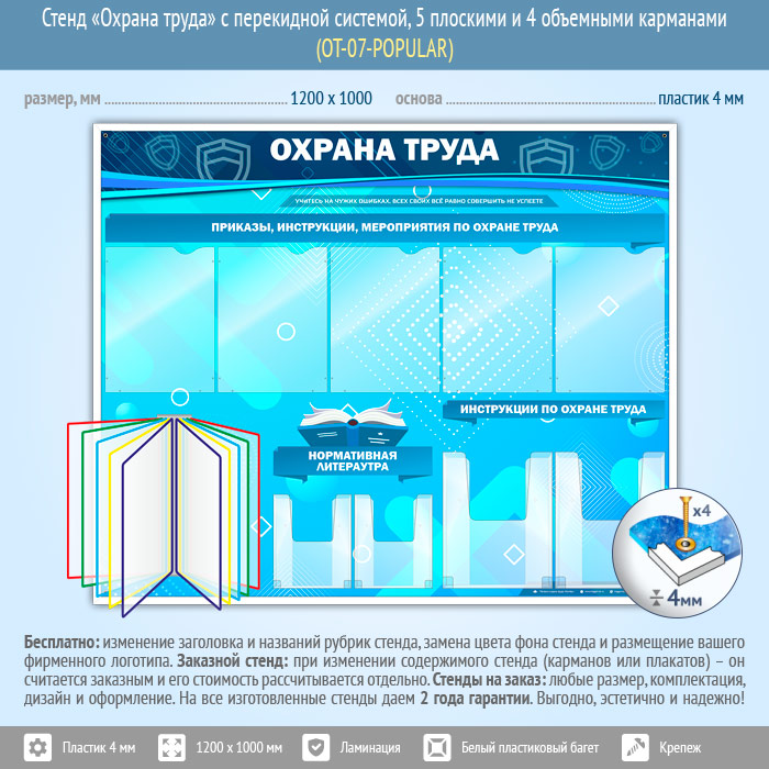 Стенд «Охрана труда» с перекидной системой, 5 плоскими и 4 объемными карманами (OT-07-POPULAR) в Омске купить