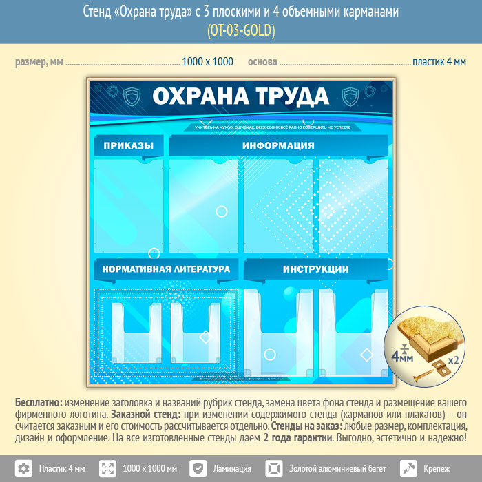 Стенд «Охрана труда» с 4 плоскими и 4 объемными карманами (OT-03-GOLD) в Омске купить