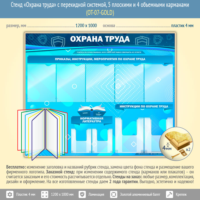 Стенд «Охрана труда» с перекидной системой, 5 плоскими и 4 объемными карманами (OT-07-GOLD) в Омске купить