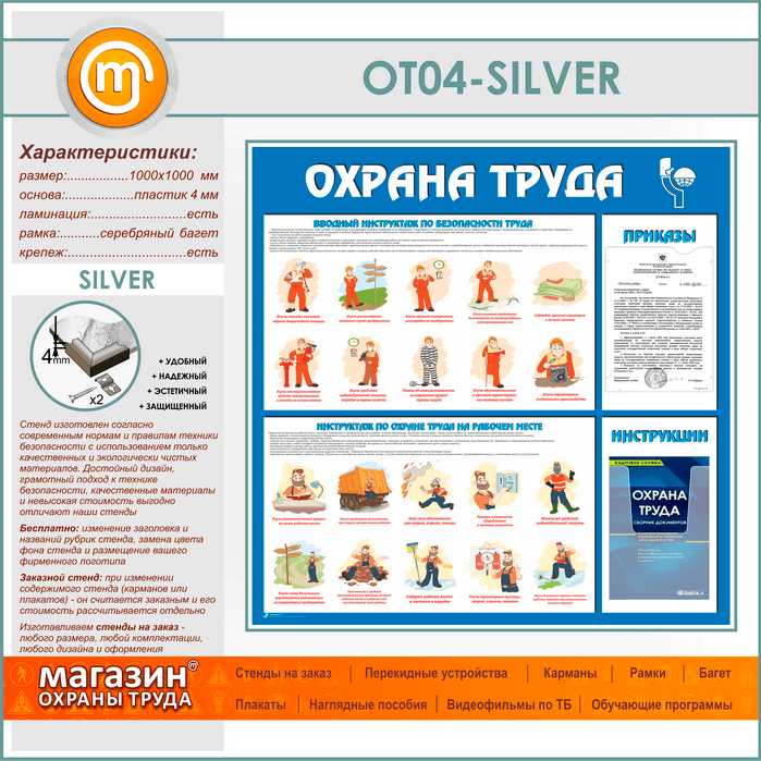 Стенд «Охрана труда» с плоским и объемным карманами (OT-04-SILVER) в Омске купить