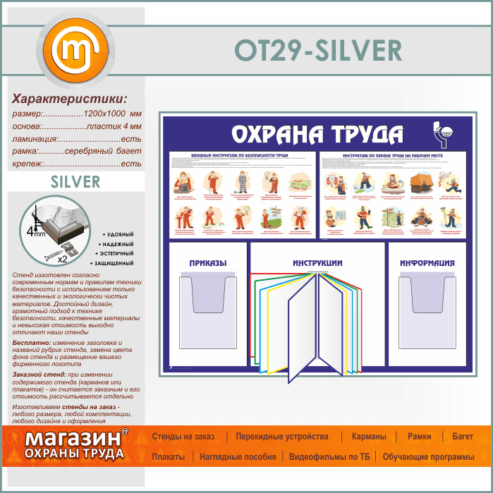 Стенд «Охрана труда» с перекидной системой и 2 объемными карманами (OT-29-SILVER) в Омске купить