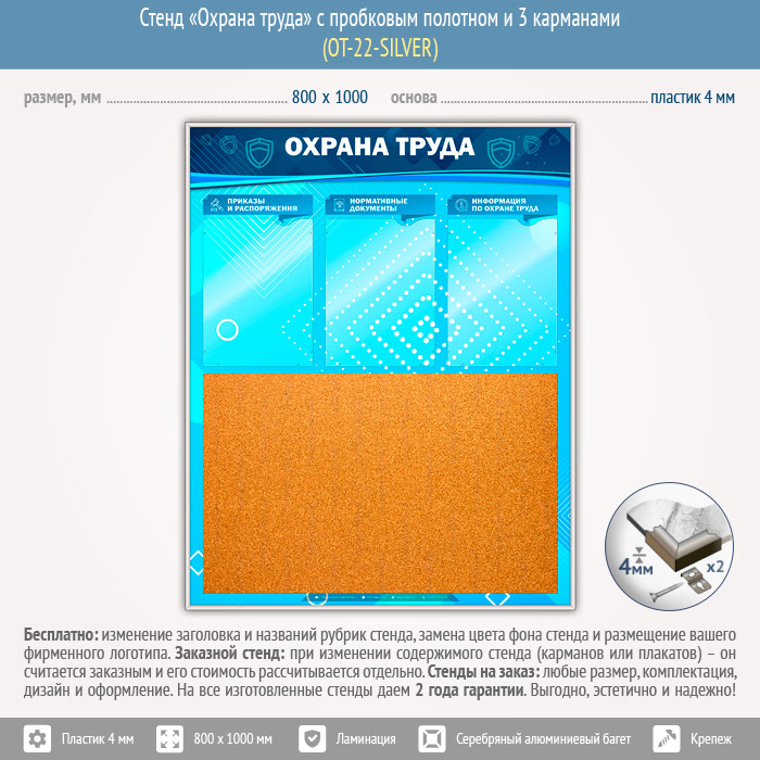 Стенд «Охрана труда» с пробковым полотном и 3 карманами (OT-22-SILVER) в Омске купить