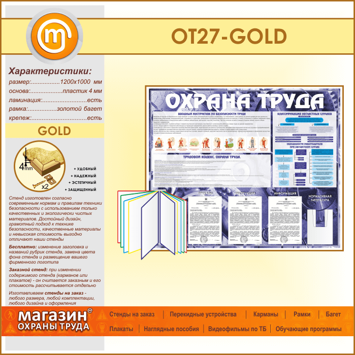 Стенд «Охрана труда» с перекидной системой, 3 плоскими и 1 объемным карманом (OT-27-GOLD) в Омске купить