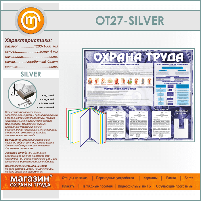 Стенд «Охрана труда» с перекидной системой, 3 плоскими и 1 объемным карманом (OT-27-SILVER) в Омске купить