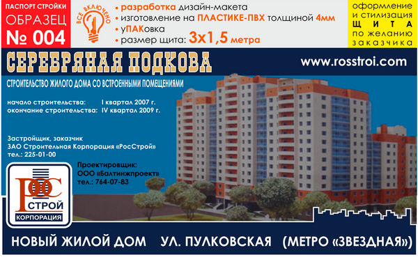 Предлагаем Вам изготовление паспорта стройки на баннерной ткани и ПВХ-пластике. В цену включены: разработка и согласование макета, изготовление и упаковка, а также НДС 18%. На данной странице представлены варианты материалов и размеров для образца № 4. Помимо представленных размеров мы можем изготовить паспорт объекта любого другого размера (цену уточняйте у менеджеров) и на любом материале (включая металл)