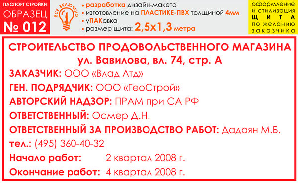 Паспорт стройки, образец № 12 (пластик 4 мм, 2500х1300 cм) в Омске купить