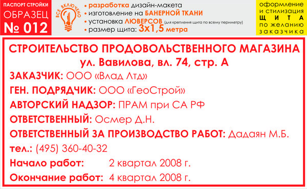 Паспорт стройки, образец № 12 (баннерная ткань, 3000х1500 cм) в Омске купить