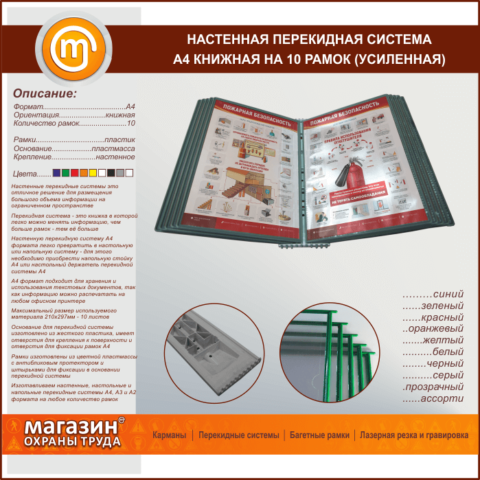 | Настенная перекидная система А4 на 10 рамок книжная (усиленная) | Настенная перекидная система А4 на 10 рамок книжная (усиленная) |