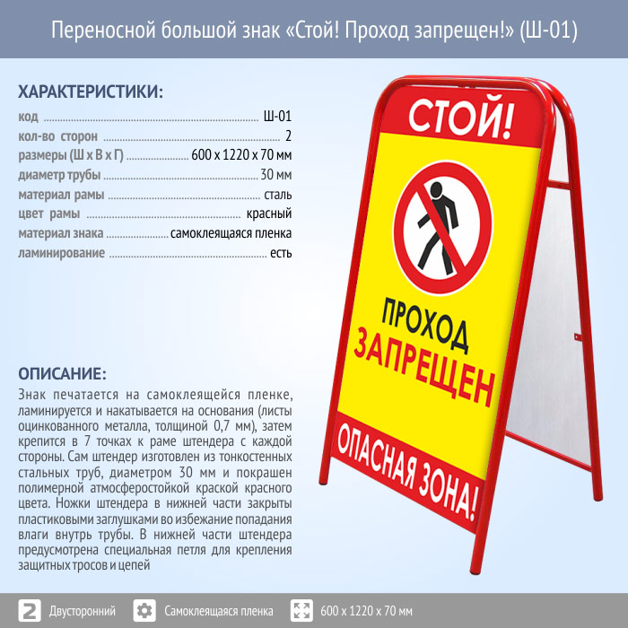 Переносной большой знак «Стой! Проход запрещен!» (Ш-01, двусторонний, самоклеящаяся пленка) в Омске купить
