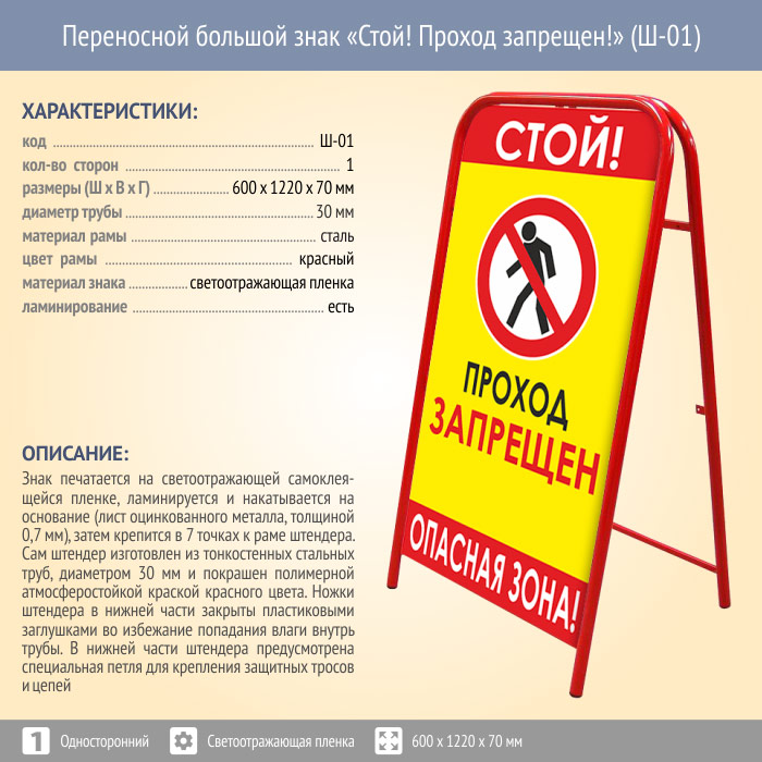 Переносной большой знак «Стой! Проход запрещен!» (Ш-01, односторонний, светоотражающая пленка) в Омске купить