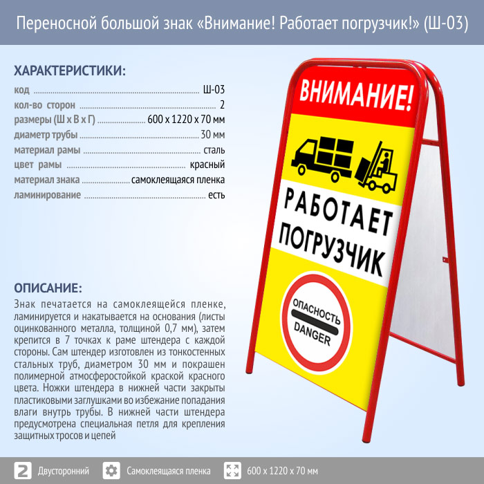 Переносной большой знак «Внимание! Работает погрузчик!» (Ш-03, двусторонний, самоклеящаяся пленка) в Омске купить