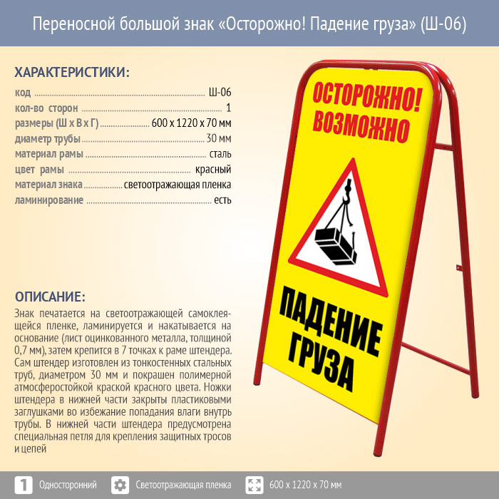 Переносной большой знак «Осторожно! Падение груза» (Ш-06, односторонний, светоотражающая пленка) в Омске купить
