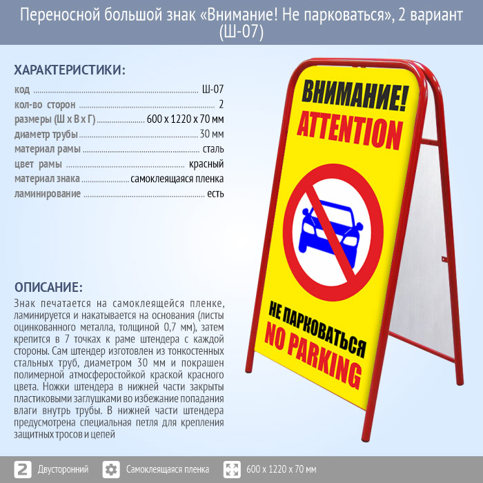 Переносной большой знак «Внимание! Не парковаться», 2 вариант (Ш-07, двусторонний, самоклеящаяся пленка) в Омске купить