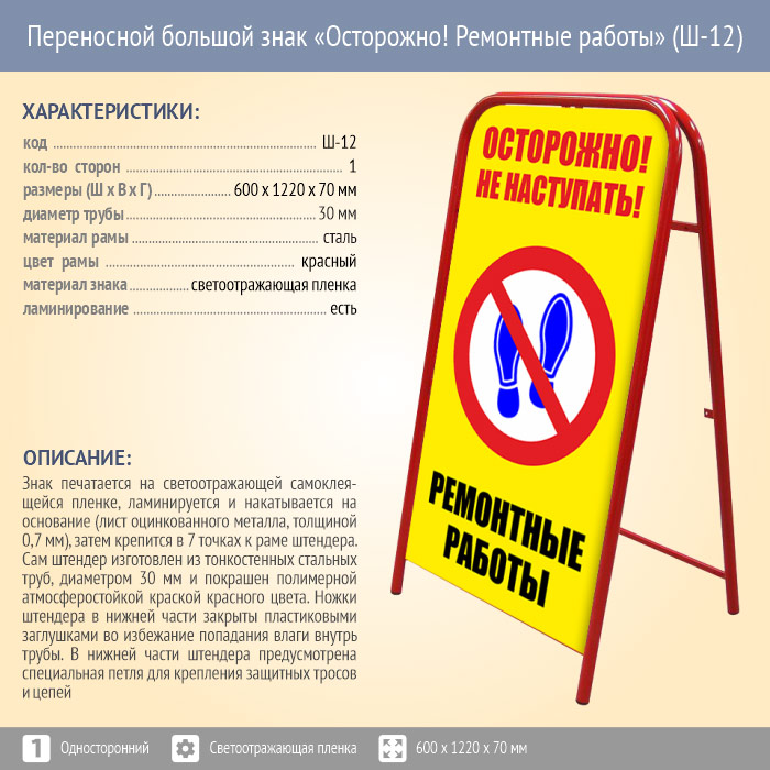 Переносной большой знак «Осторожно! Ремонтные работы» (Ш-12, односторонний, светоотражающая пленка) в Омске купить