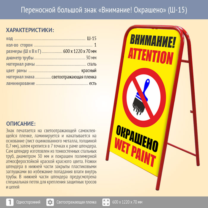Переносной большой знак «Внимание! Окрашено» (Ш-15, односторонний, светоотражающая пленка) в Омске купить