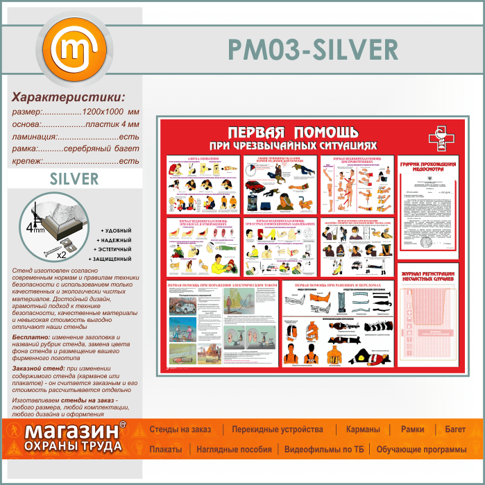 Стенд «Первая помощь при чрезвычайных ситуациях» с плоским и объемным карманами (PM-03-SILVER) в Омске купить