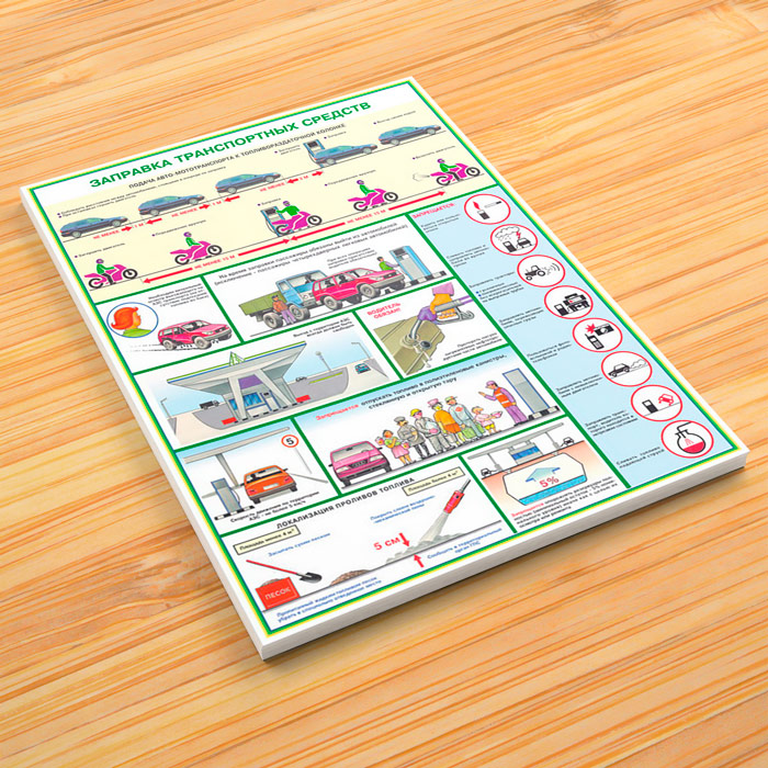 - Плакат «Заправка транспортных средств» – подача транспорта к колонке, обязанности водителя, техника безопасности, локализация пролива топлива