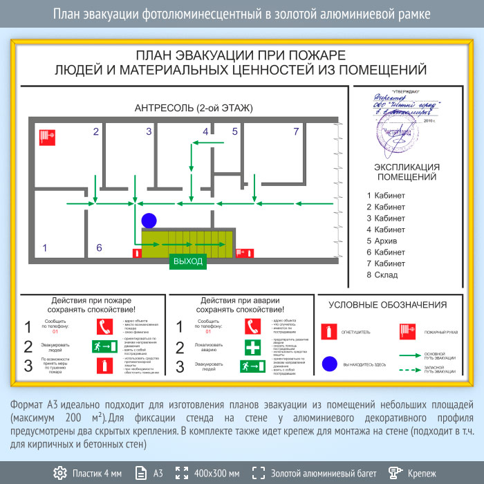 План эвакуации в золотой алюминиевой рамке (А3 формат) в Омске купить