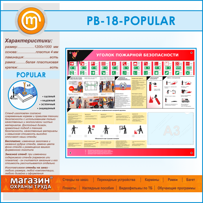 Стенд «Уголок пожарной безопасности» с карманом А3 формата (PB-18-POPULAR) в Омске купить