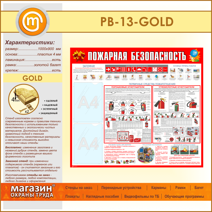 Стенд «Пожарная безопасность» с 2 карманами (PB-13-GOLD) в Омске купить