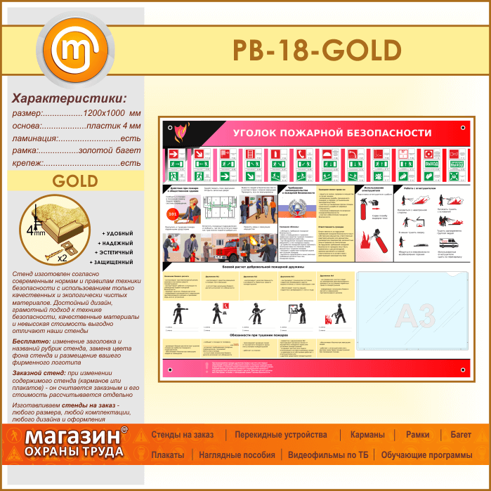 Стенд «Уголок пожарной безопасности» с карманом А3 формата (PB-18-GOLD) в Омске купить