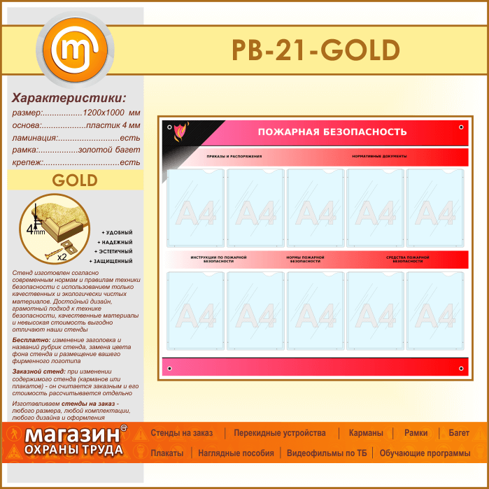 Стенд «Пожарная безопасность» с 10 карманами (PB-21-GOLD) в Омске купить