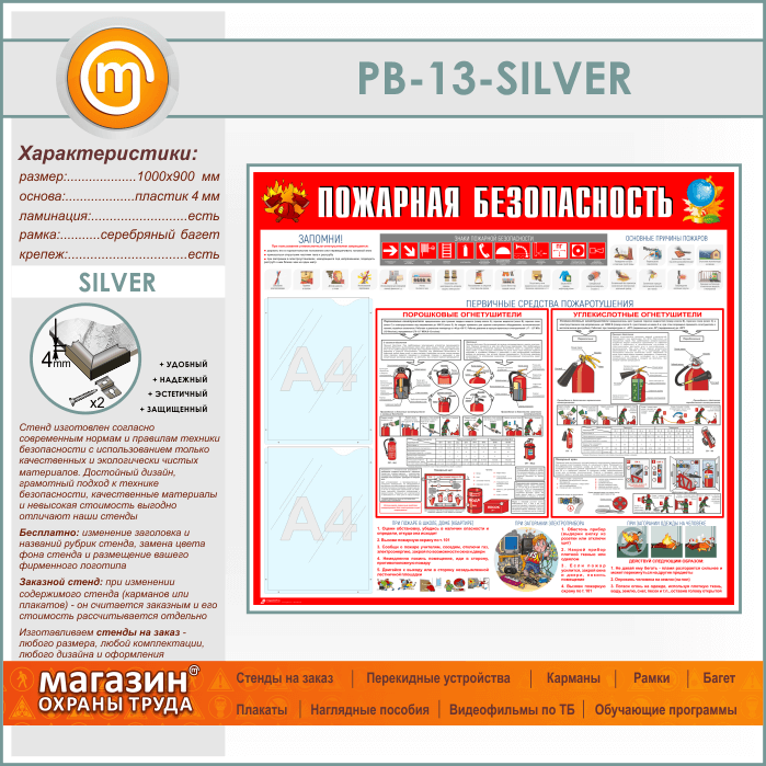 Стенд «Пожарная безопасность» с 2 карманами (PB-13-SILVER) в Омске купить