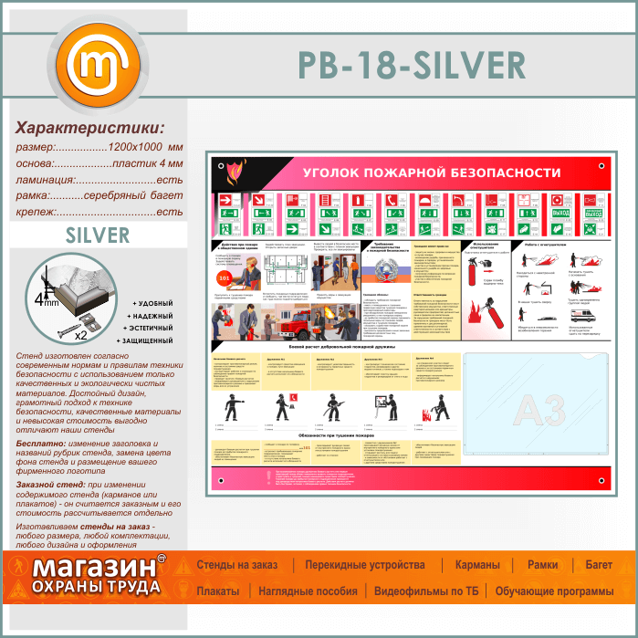 Стенд «Уголок пожарной безопасности» с карманом А3 формата (PB-18-SILVER) в Омске купить