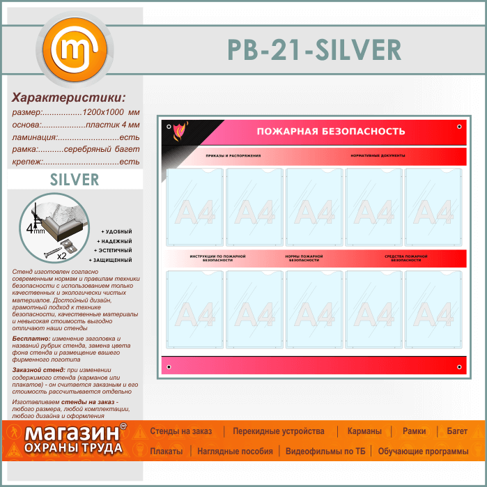 Стенд «Пожарная безопасность» с 10 карманами (PB-21-SILVER) в Омске купить