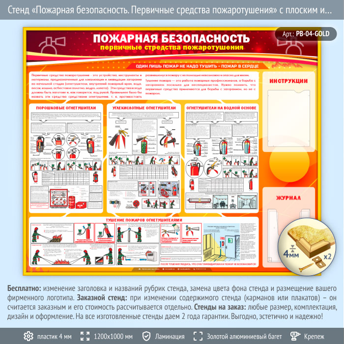 Стенд «Пожарная безопасность. Первичные средства пожаротушения» с плоским и объемным карманами (PB-04-GOLD) в Омске купить