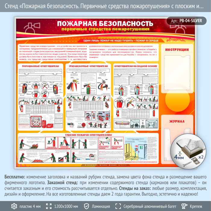 Стенд «Пожарная безопасность. Первичные средства пожаротушения» с плоским и объемным карманами (PB-04-SILVER) в Омске купить
