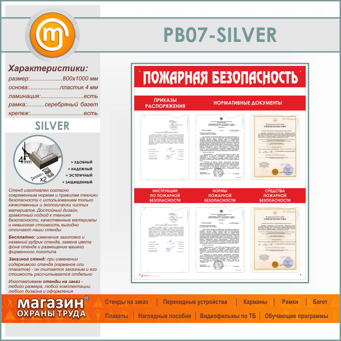 Стенд «Пожарная безопасность» с 6 карманами (PB-07-SILVER) в Омске купить