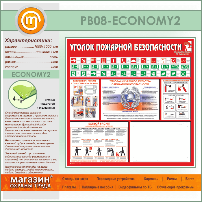 Стенд «Уголок пожарной безопасности» с карманом А3 формата (PB-08-ECONOMY2) в Омске купить
