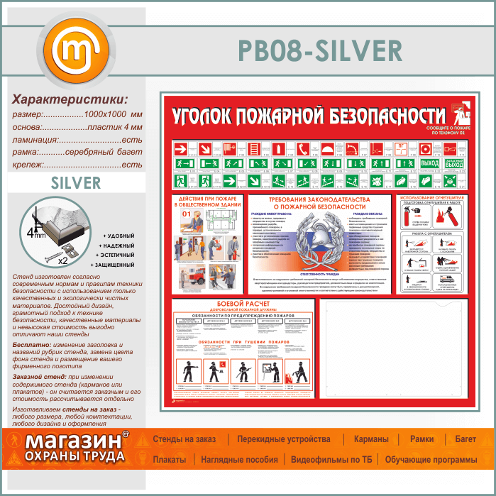 Стенд «Уголок пожарной безопасности» с карманом А3 формата (PB-08-SILVER) в Омске купить