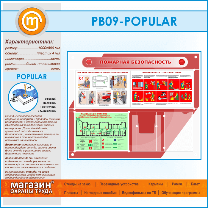 Стенд «Пожарная безопасность» с планом эвакуации, плоским и объемным карманами (PB-09-POPULAR) в Омске купить