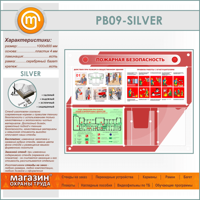 Стенд «Пожарная безопасность» с планом эвакуации, плоским и объемным карманами (PB-09-SILVER) в Омске купить