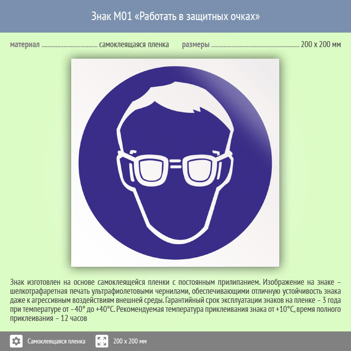 Знак M01 «Работать в защитных очках» (пленка, 200х200 мм) в Омске купить