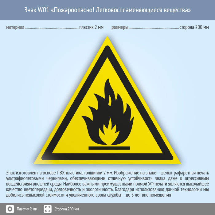 Знак W01 «Пожароопасно! легковоспламеняющиеся вещества» (пластик, сторона 200 мм) в Омске купить