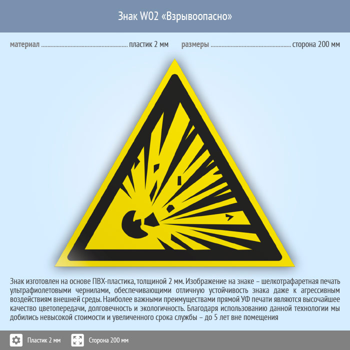 Знак W02 «Взрывоопасно» (пластик, сторона 200 мм) в Омске купить