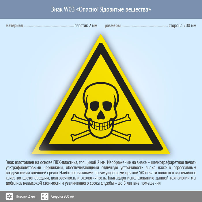 Знак W03 «Опасно! ядовитые вещества» (пластик, сторона 200 мм) в Омске купить