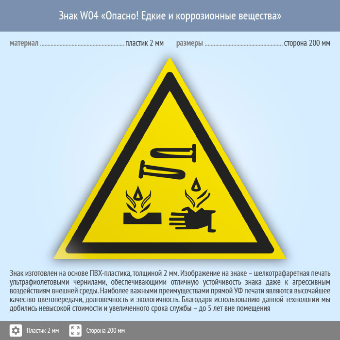 Знак W04 «Опасно! едкие и коррозионные вещества» (пластик, сторона 200 мм) в Омске купить