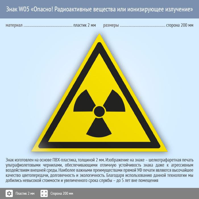 Знак W05 «Опасно! радиоактивные вещества или ионизирующее излучение» (пластик, сторона 200 мм) в Омске купить