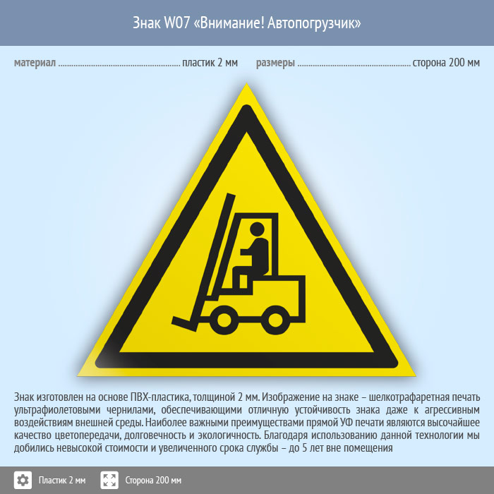 Знак W07 «Внимание! автопогрузчик» (пластик, сторона 200 мм) в Омске купить