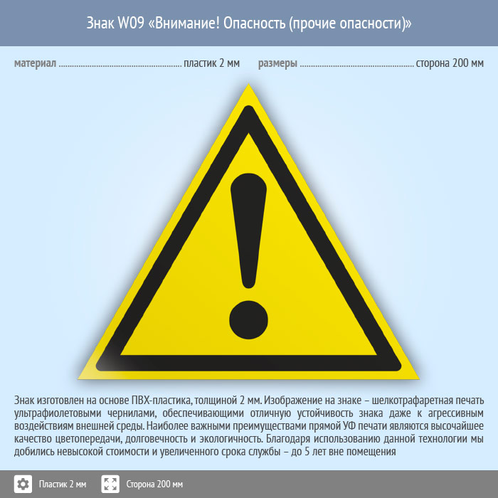 Знак W09 «Внимание! опасность (прочие опасности)» (пластик, сторона 200 мм) в Омске купить