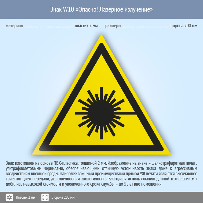 Знак W10 «Опасно! лазерное излучение» (пластик, сторона 200 мм) в Омске купить