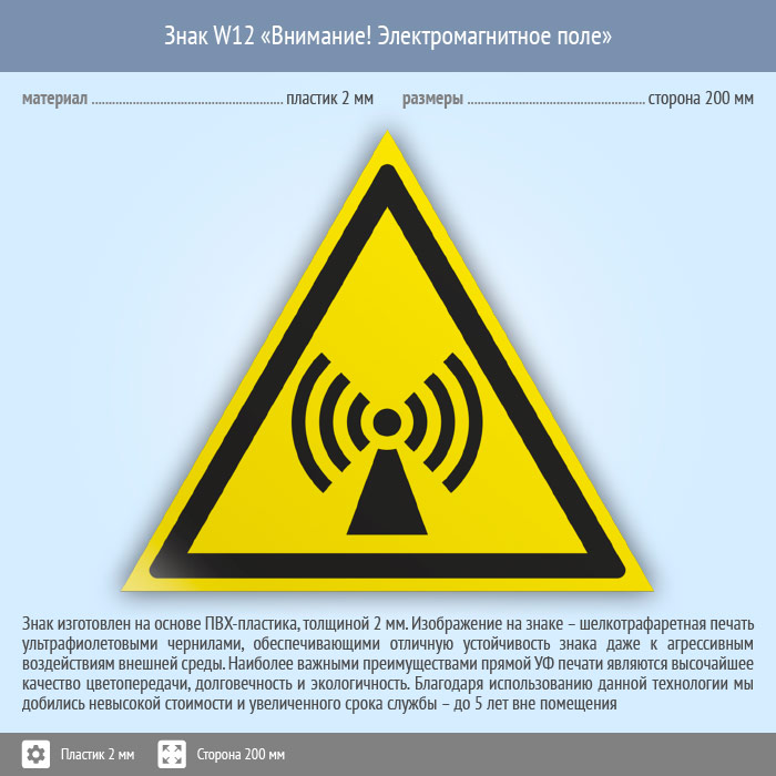 Знак W12 «Внимание! электромагнитное поле» (пластик, сторона 200 мм) в Омске купить